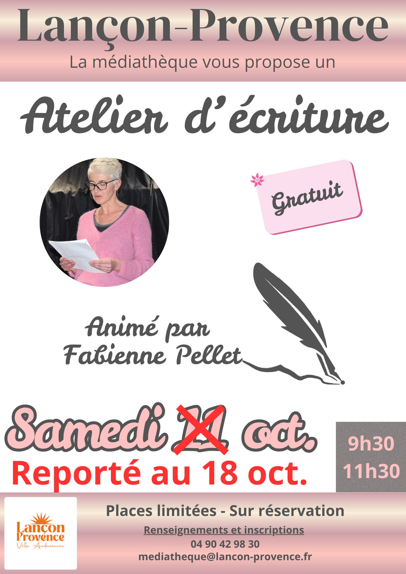 Cet atelier d'écriture, ouvert à tous, est un espace qui vous accueillera sous le regard bienveillant de son animatrice, pour laisser libre cours à votre créativité.