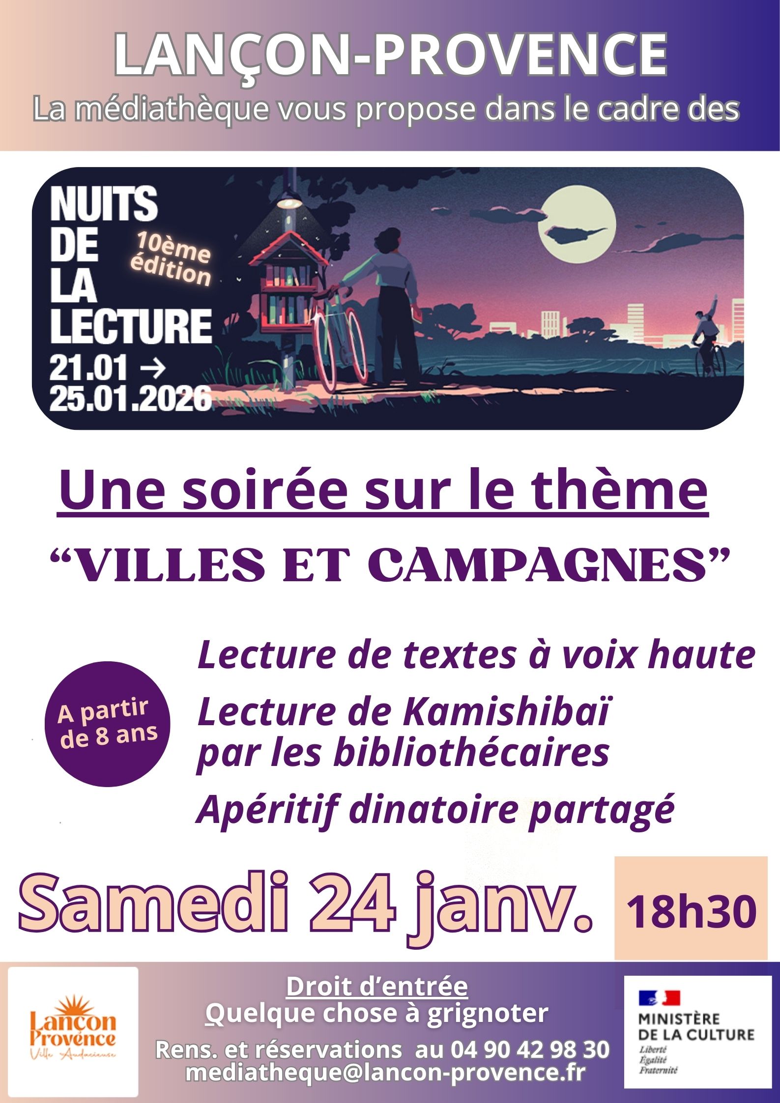 Dans le cadre des Nuits de la Lecture, événement national, nous vous proposons une soirée sur le thème de l'année « Villes et campagnes »