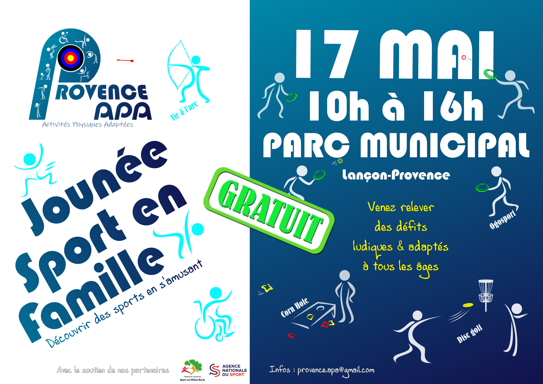 Provence APA (Activités Physiques Adaptées) vous donne rendez-vous dimanche 17 mai, de 10h à 16h, au parc municipal, pour une journée sport en famille placée sous le signe de la découverte et de la convivialité.
