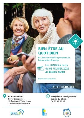 Le Service au Bel Age a développé un partenariat avec l'ASEPT PACA et vous propose 4 ateliers par an, gratuits, sur inscription préalable; autour des thèmes sur le bien-être et le bien-vieillir, mis en place par des professionnels (sophrologie, gymnastique adaptée, initiation à l'informatique, cours de secourisme, atelier mémoire, etc...)